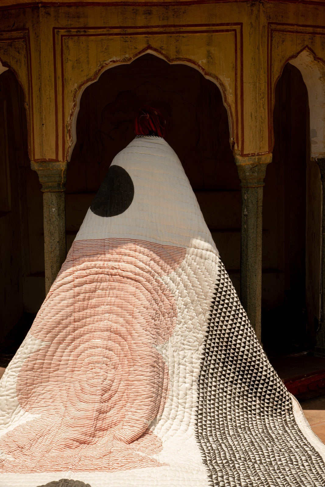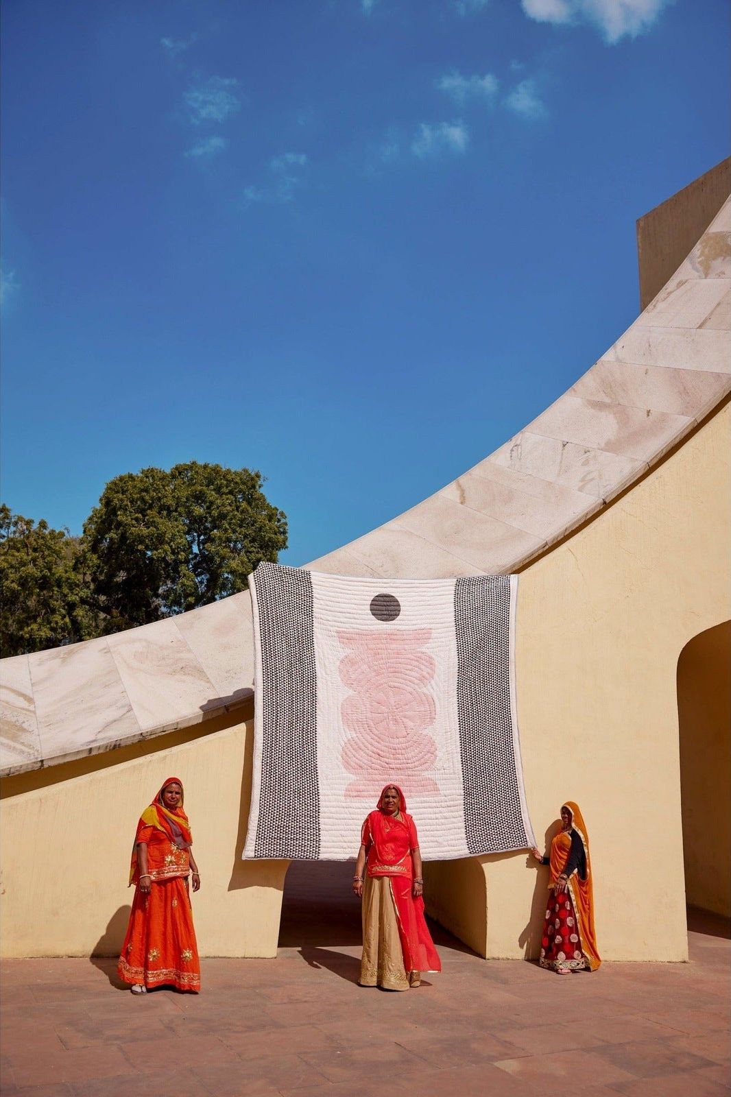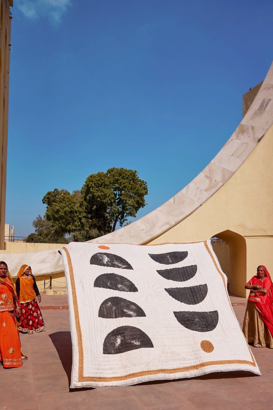 The design is hand-pressed onto each quilt using hand-carved wooden blocks dipped in dyes. The printed cotton shells are brought to the homes of quiltmakers, who stuff and stitch the quilts by hand, creating the final product.