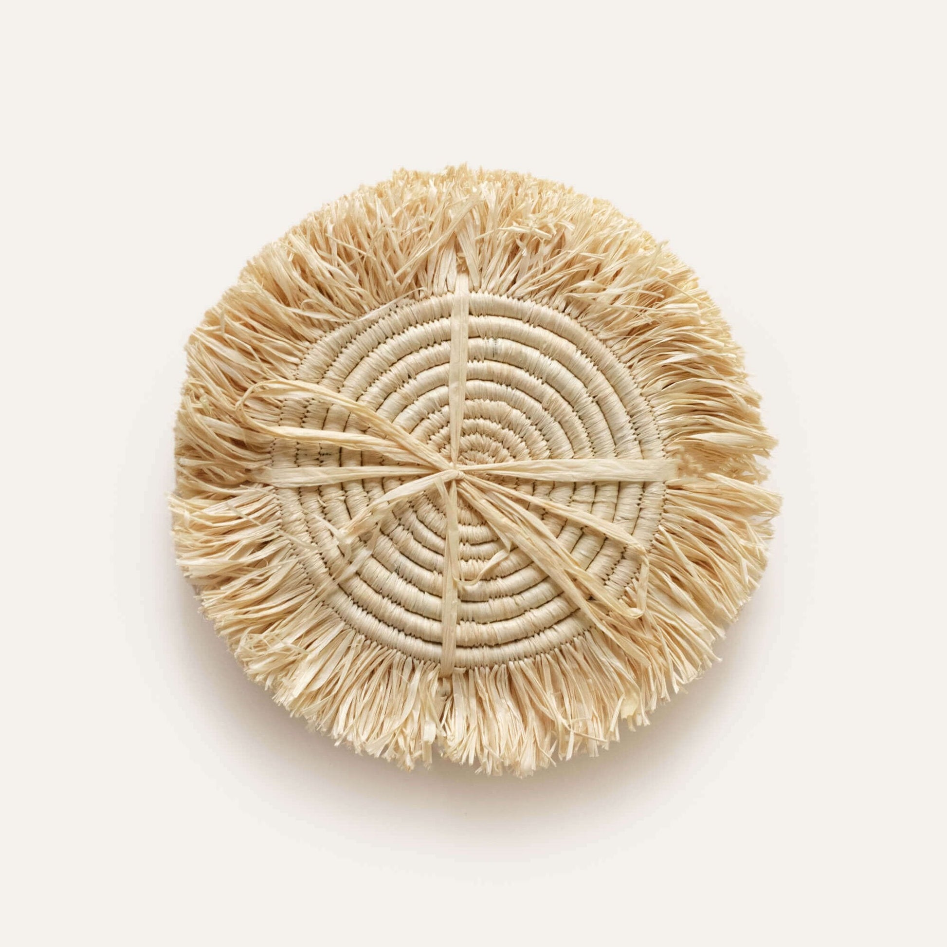 - The ideal housewarming gift, the Mixed Raffia Fringe Set of 4 Coasters adds a nice touch to any tabletop!