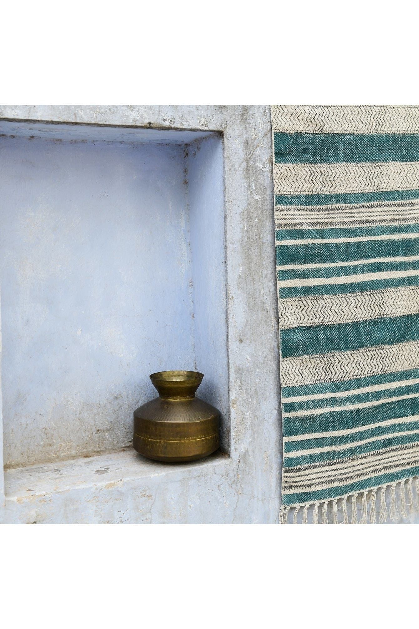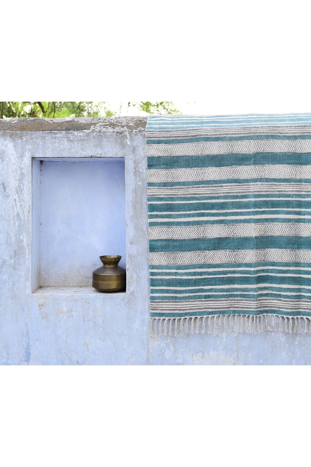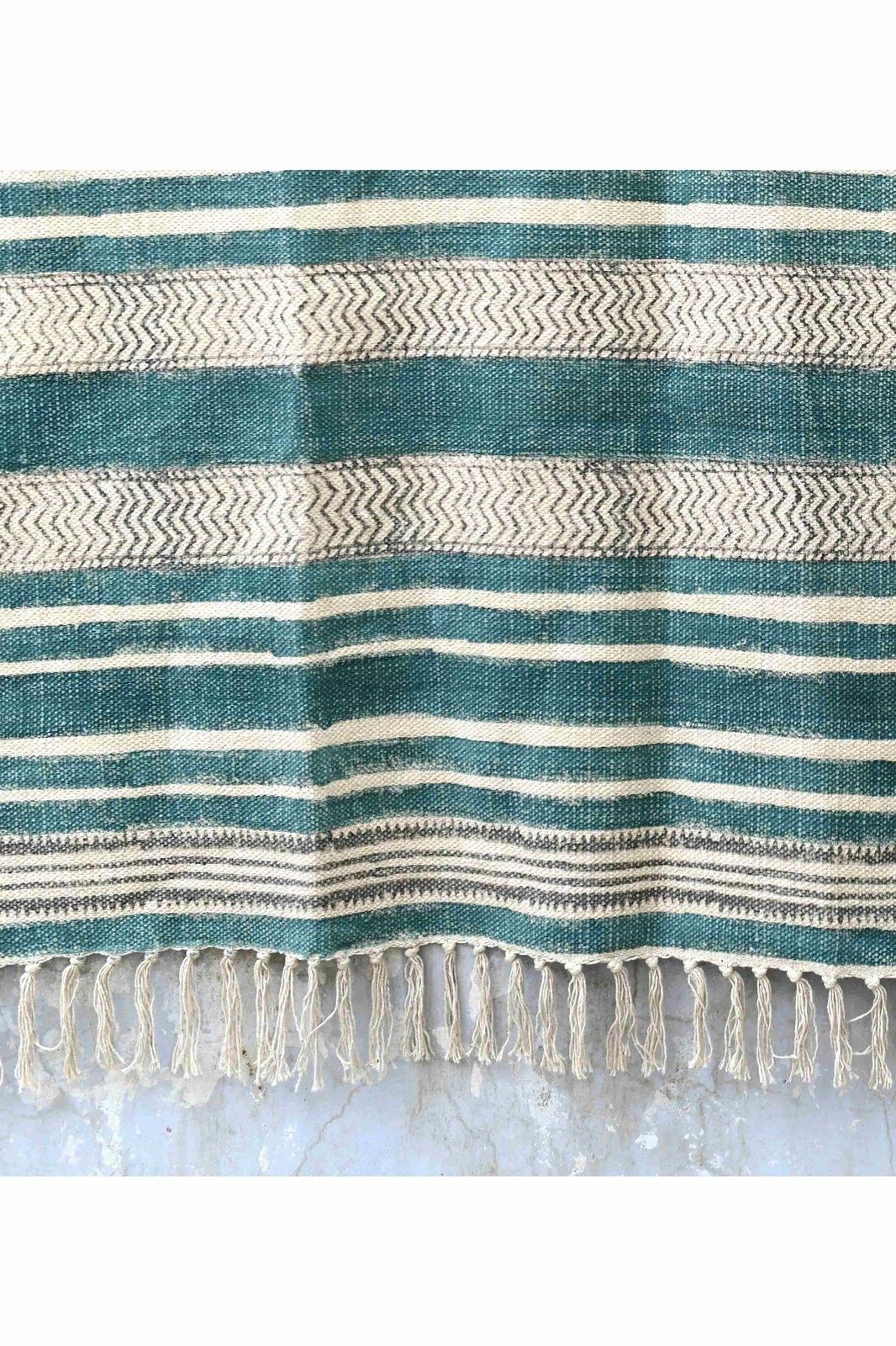 The design is hand-pressed onto each rug using hand-carved wooden blocks dipped in dyes. All rugs are made in small batches.