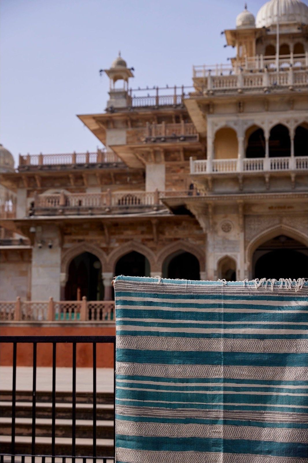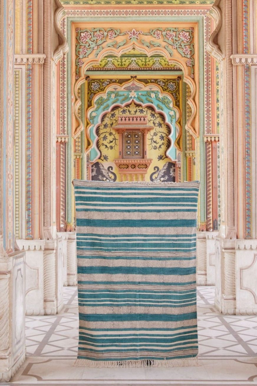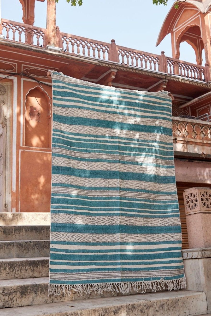 Each rug is handmade, requiring attention from 4 artisans, including wood carvers, block printers, weavers, and dye specialists.