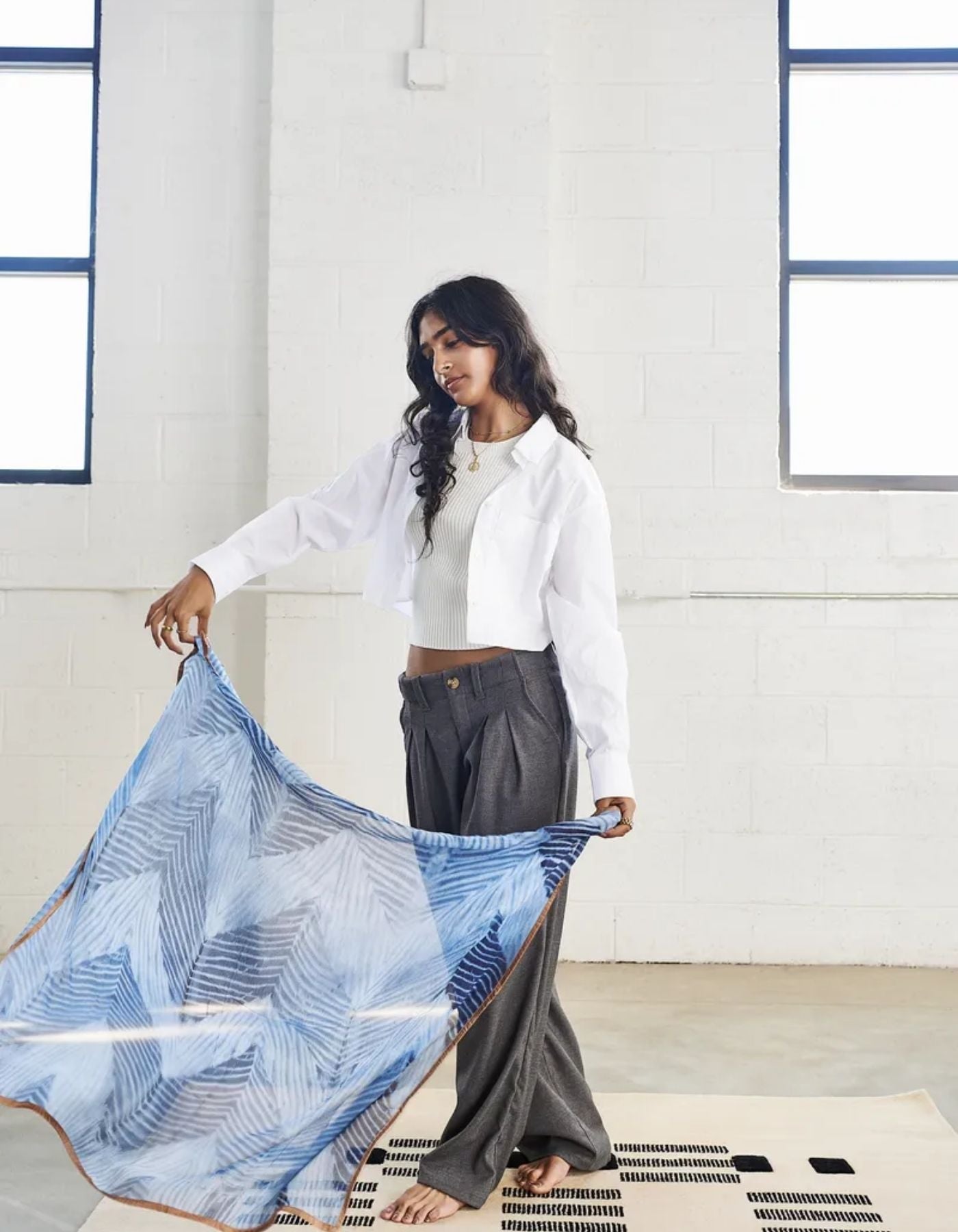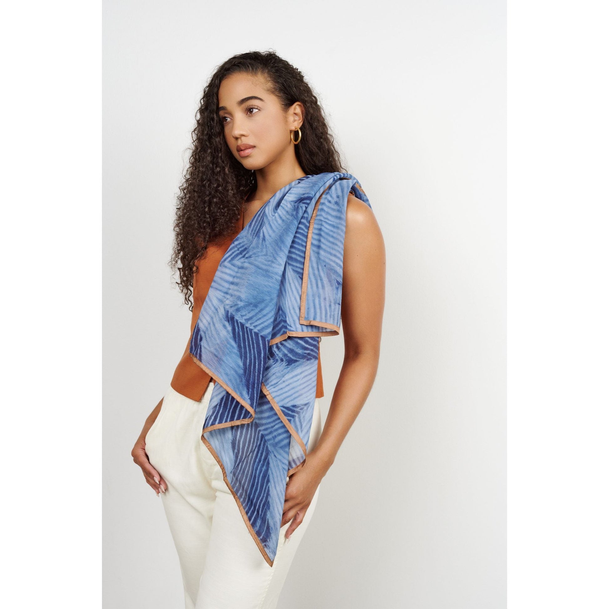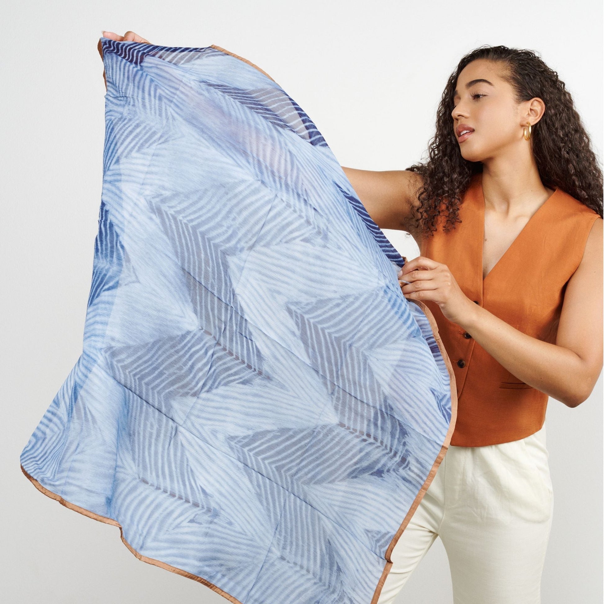 Add a tinge of serenity with our beautiful Samu Indigo Scarf which is apure statement piece that adds modern and timeless quality as an accessory which can be used suitably for personal / workwear, as a travel accessory or a thoughtful gift. Hem of silk give it a clean modern and elegant look. Classic in design, Samu is one of a kind scarf / wrap , a true sustainable luxury statement piece handcrafted by artisans in India using the technique of Arashi shibori, Created all by hand these scarves are made in small careful batches, each piece being unique as it is completely handcrafted. Natural elements like rich natural indigo are used to create dyes for Samu scarf. Material: Silk Chiffon Size: 34" x34" (square) Color: Shibori print in indigo and gold hem in silk Artisan base: Ethically & responsibly handmade by artisans in India Wash care: Gently hand wash using gentle detergents. Hang dry in cool shaded place. What Makes Your Purchase Sustainable? - 100% organic dyes sourced locally and made to order. - Support employment of women artisans. - 100% handmade manufacturing process by artisans. - All pieces are sun dried / air dried to conserve energy. - Use only 100% natural + biodegradable responsibly sourced materials. - Small batch production ensures higher quality & less wastage. Each product comes in a biodegradable recycled pouch.