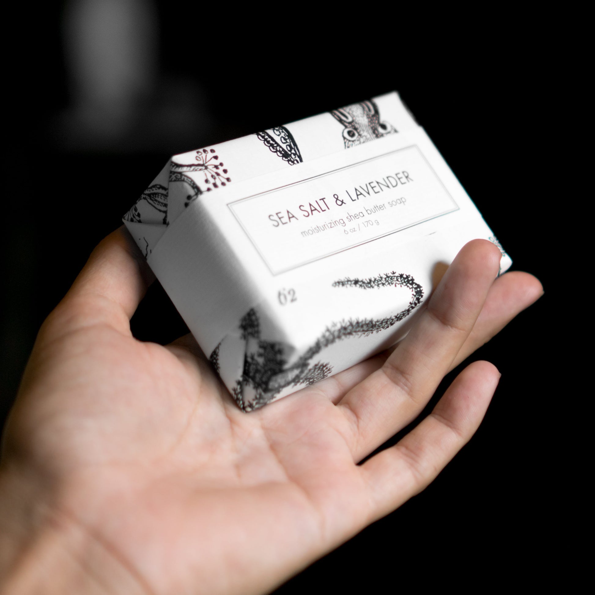 SCENT PROFILE: Like fresh sea air! This perfumed soap combines crisp clean sea spray with the soothing essential oil of lavender. SIZE/DESCRIPTION: 6+oz. Sea Salt & Lavender shea butter bath bar packaged in our signature botanical and vintage illustrations. DETAILS: Superfatted to be extra moisturizing and skin softening, these shea butter bath bars are long-lasting and luxurious. INGREDIENTS: This handcrafted soap is made in small batches of saponifed oils of coconut, RSPO-certified palm, and shea butter. Scented with our own proprietary blend of phthalate-free fragrance oils and essential oils. All of Formulary 55 products are made in the USA, vegan, certified cruelty-free, SLS-free, and paraben-free