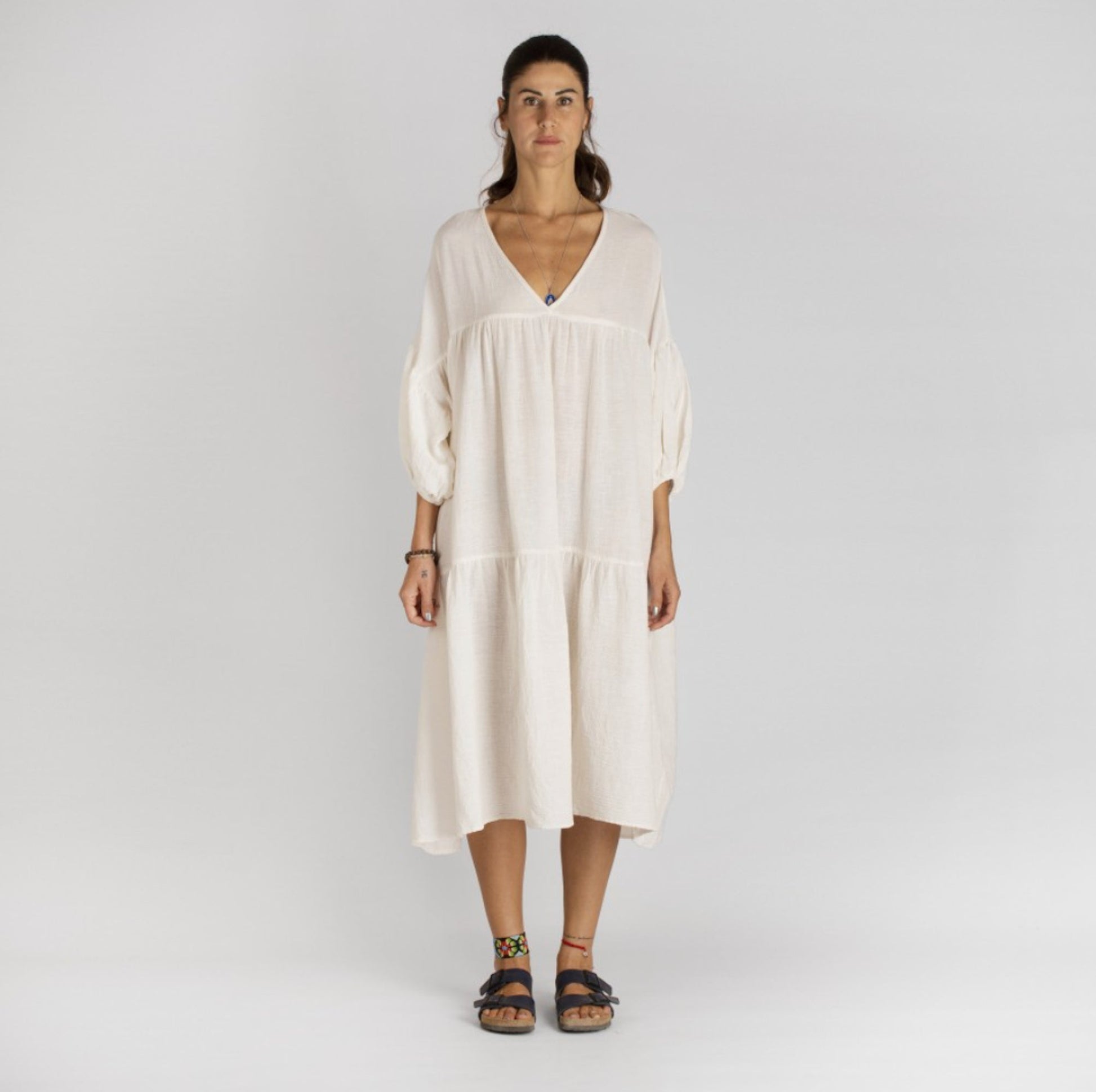 Discover the effortless sophistication of our generously oversized fully-pleated dress, destined to become your signature casual attire for the spring and summer seasons. This micro-pleated piece features a tiered skirt with a sweeping hem, a deep V-neckline, and 3/4 length cocoon sleeves with elastic cuffs, seamlessly blending comfort and sophistication.