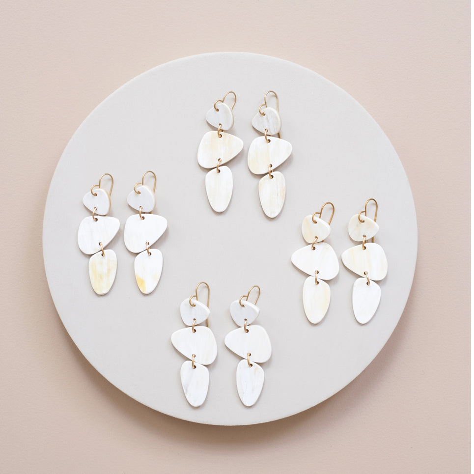 These simple Stacked Stone Earrings are reminiscent of perfectly balanced cairn trail markers. Hand carved and polished from white cow horn, these earrings will provide direction throughout your day.