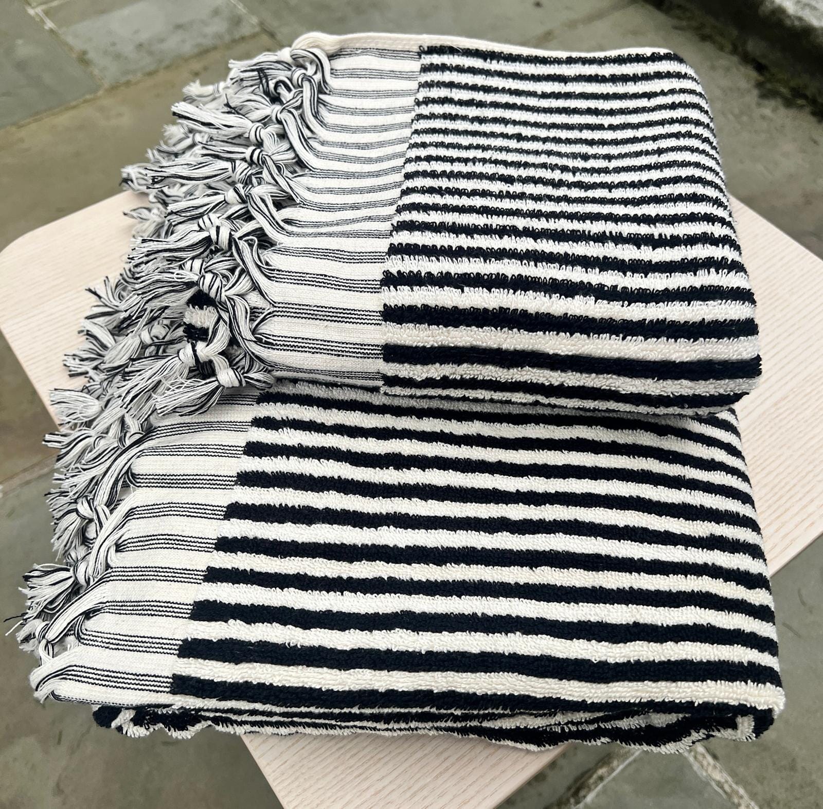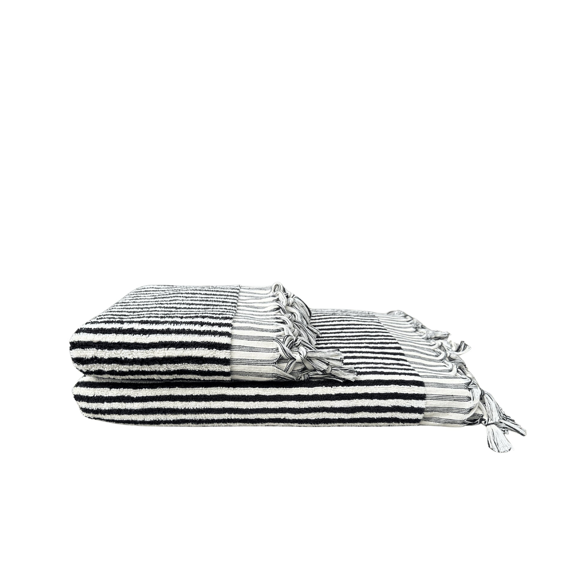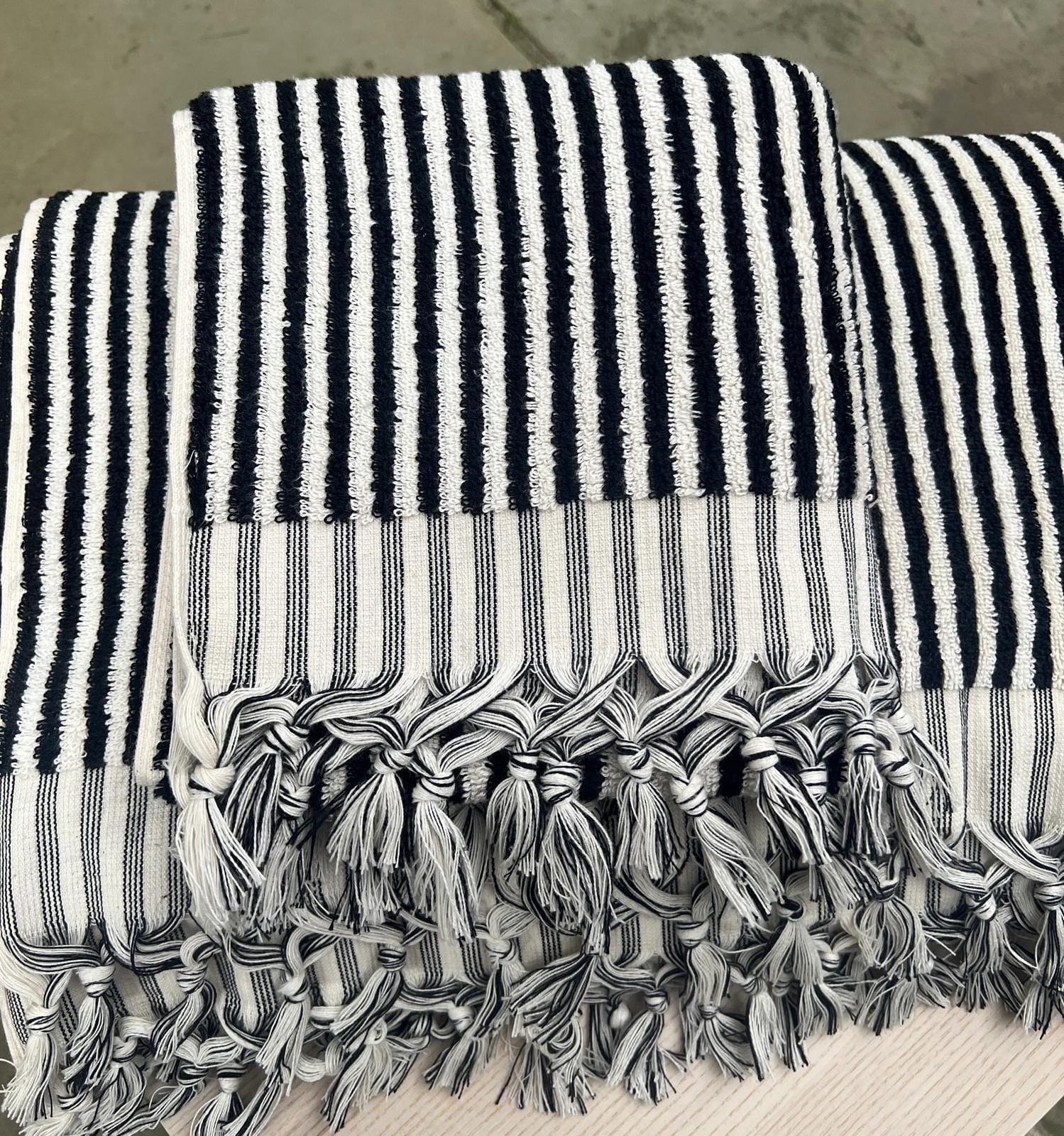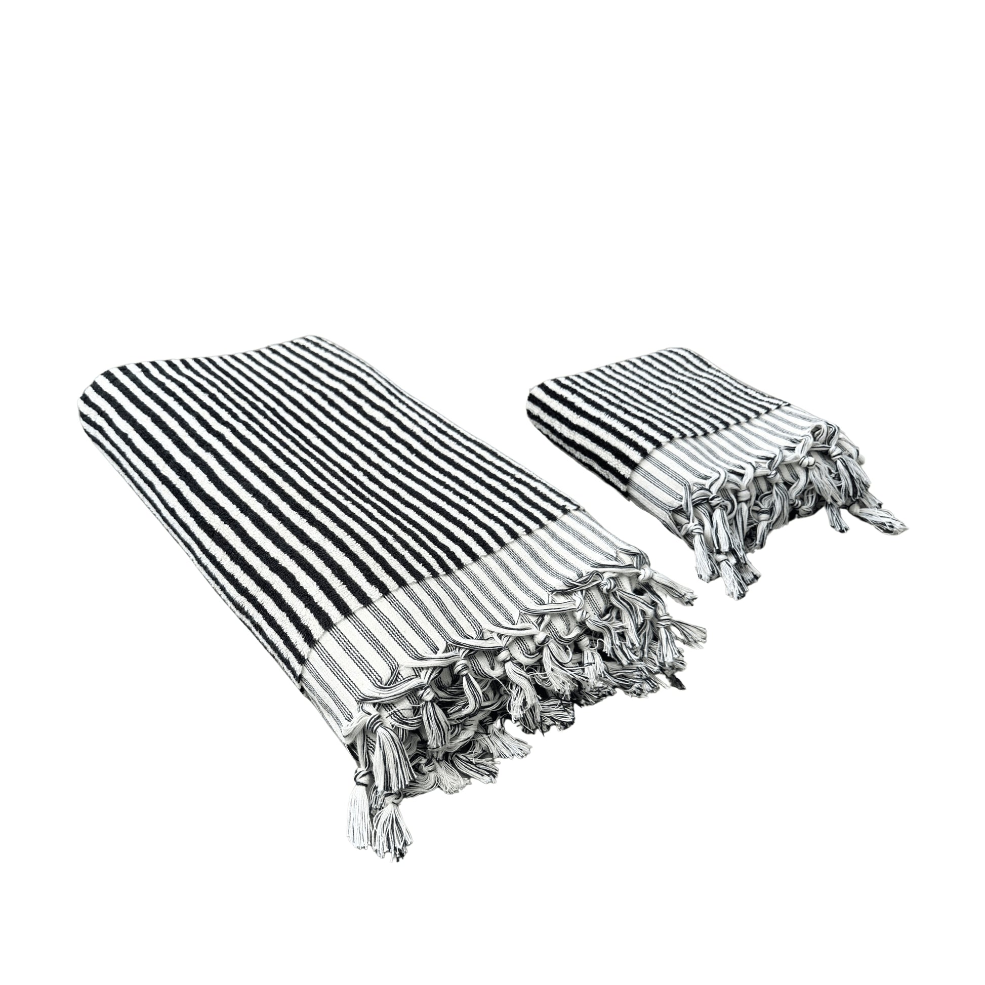 Meet the newest addition to our Turkish towel set collection! The Striped Towel Set is perfect for those who prefer their towels thicker. Still hand-loomed from 100% Premium Turkish Cotton, it features an elegant pattern of stripes in beautiful colors. It is luxuriously soft, ultra-plush, and highly absorbent. The set includes a full-size bath sheet and a generously sized hand towel.