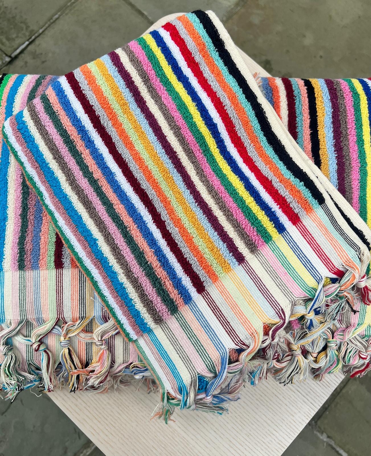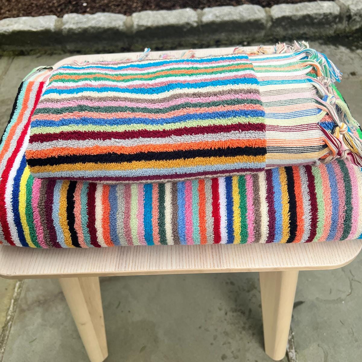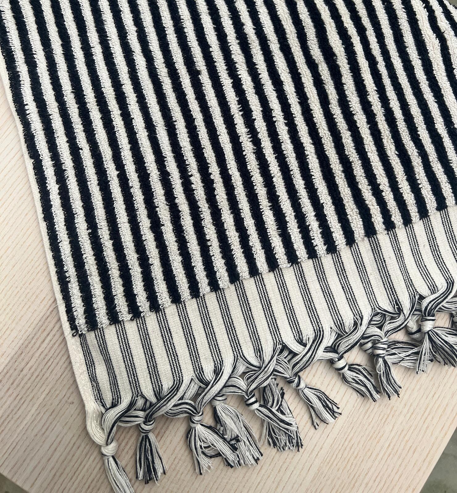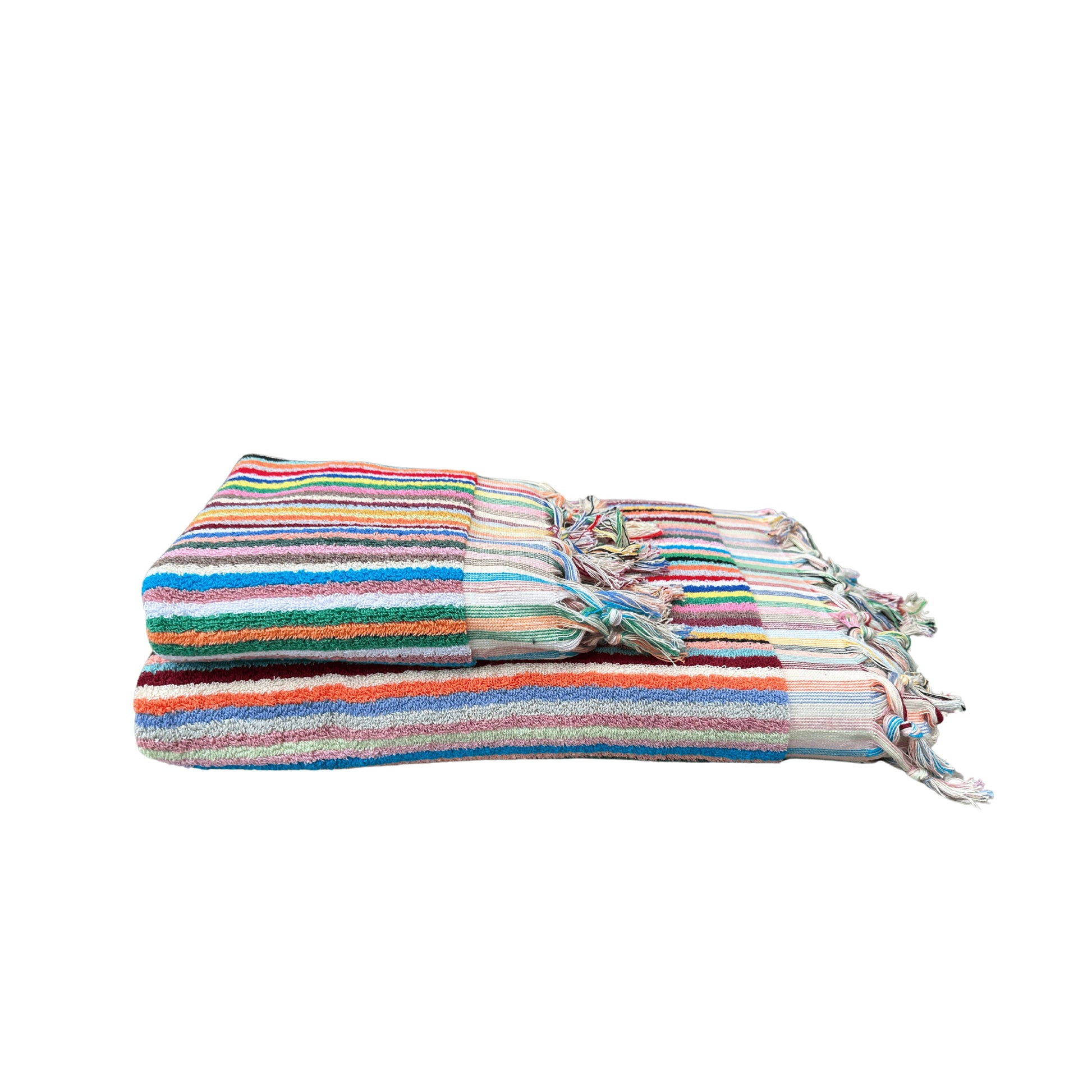 Meet the newest addition to our Turkish towel set collection! The Striped Towel Set is perfect for those who prefer their towels thicker. Still hand-loomed from 100% Premium Turkish Cotton, it features an elegant pattern of stripes in beautiful colors. It is luxuriously soft, ultra-plush, and highly absorbent. The set includes a full-size bath sheet and a generously sized hand towel.