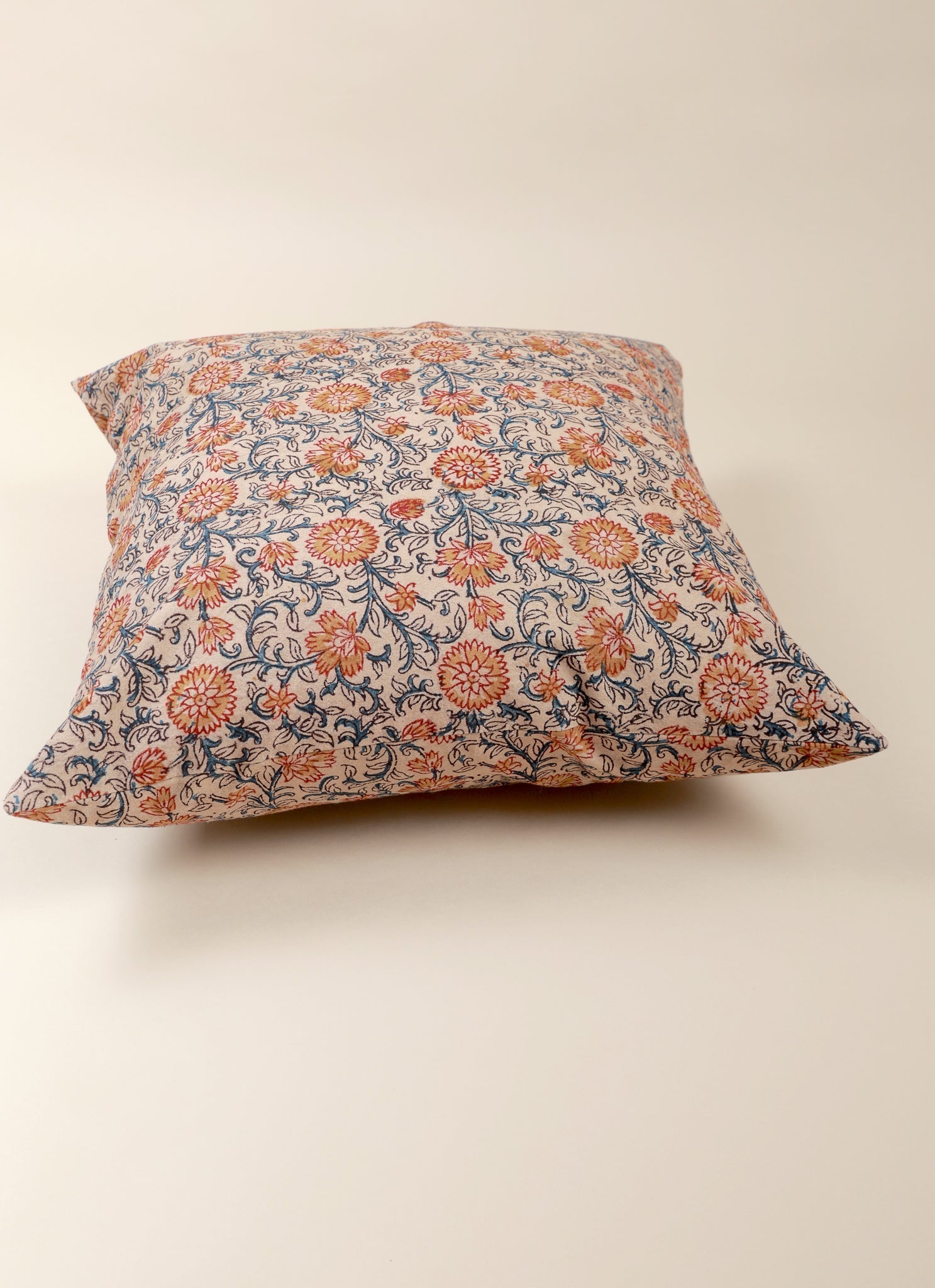 Brighten up your living space with our Sunset Horizon Pillow. Featuring vibrant kalamkari patterns in a harmonious blend of orange, blue, and beige this pillow cover brings a pop of colour and artisanal charm to any living space.