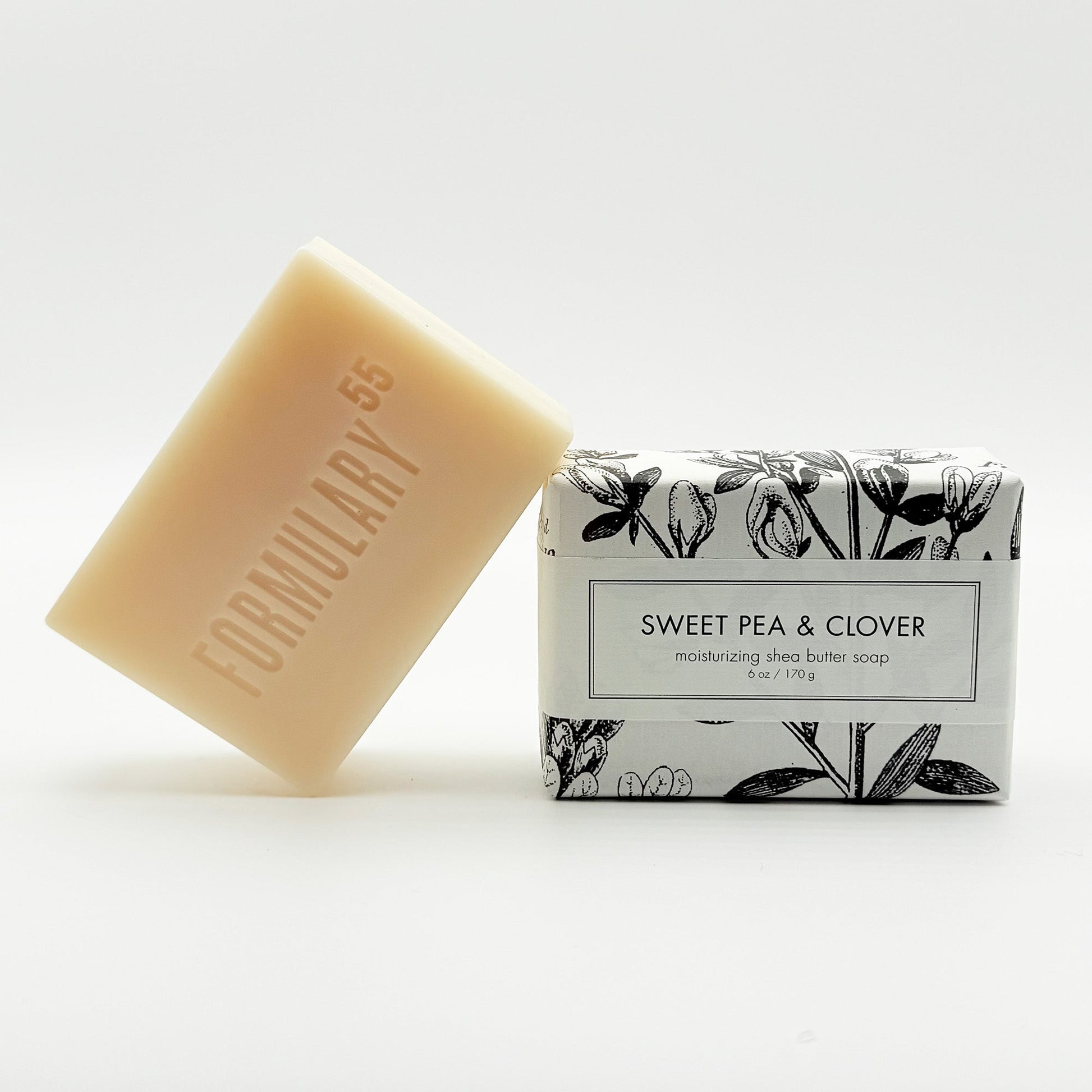 SCENT PROFILE: a delicate floral fragrance, one of the softest and most feminine florals we make, with a bit of berry and green clover added to the mix. SIZE/DESCRIPTION: 6+oz. Sweet Pea & Clover shea butter bath bar packaged in our signature botanical and vintage illustrations. DETAILS: Superfatted to be extra moisturizing and skin softening, these shea butter bath bars are long lasting and luxurious. INGREDIENTS: This handcrafted soap is made in small batches of saponified oils of coconut, RSPO-certified palm, and shea butter. Scented with our own proprietary blend of phthalate free fragrance oils and essential oils. All of Formulary 55 products are made in the USA, vegan, cruelty-free, SLS-free, and paraben free