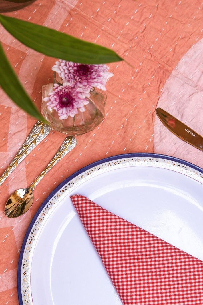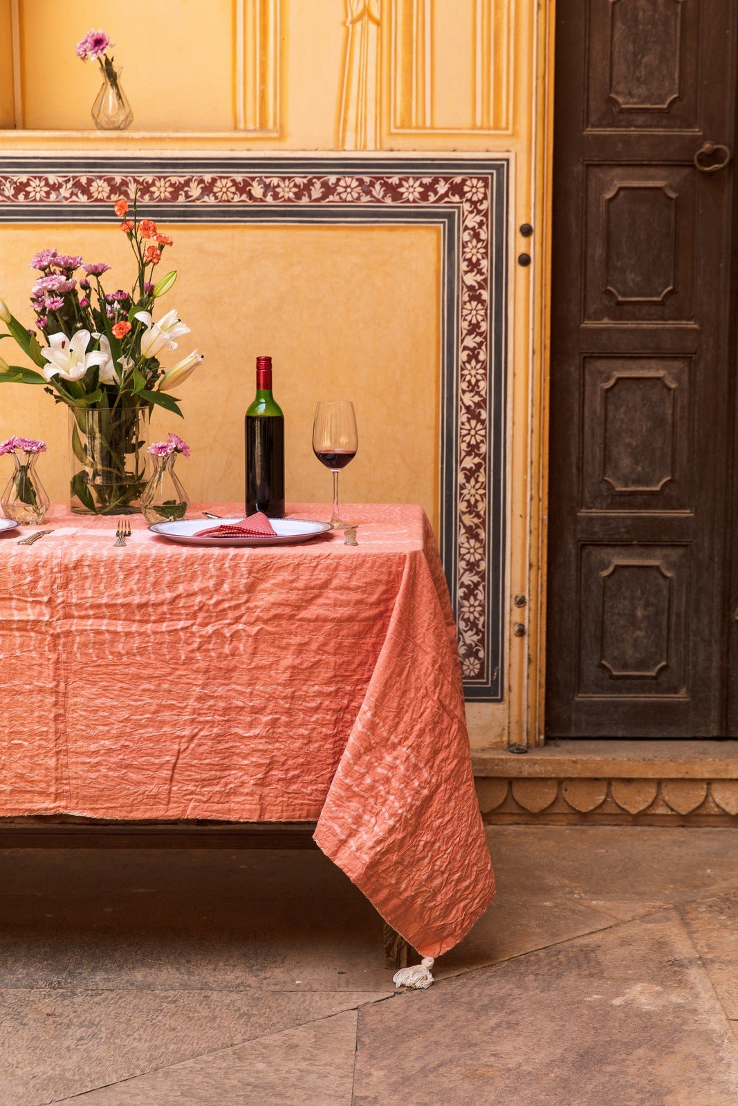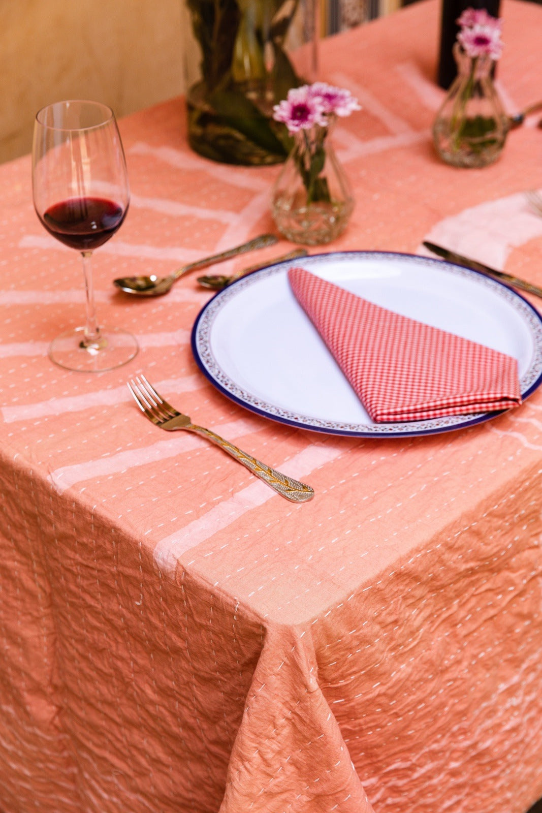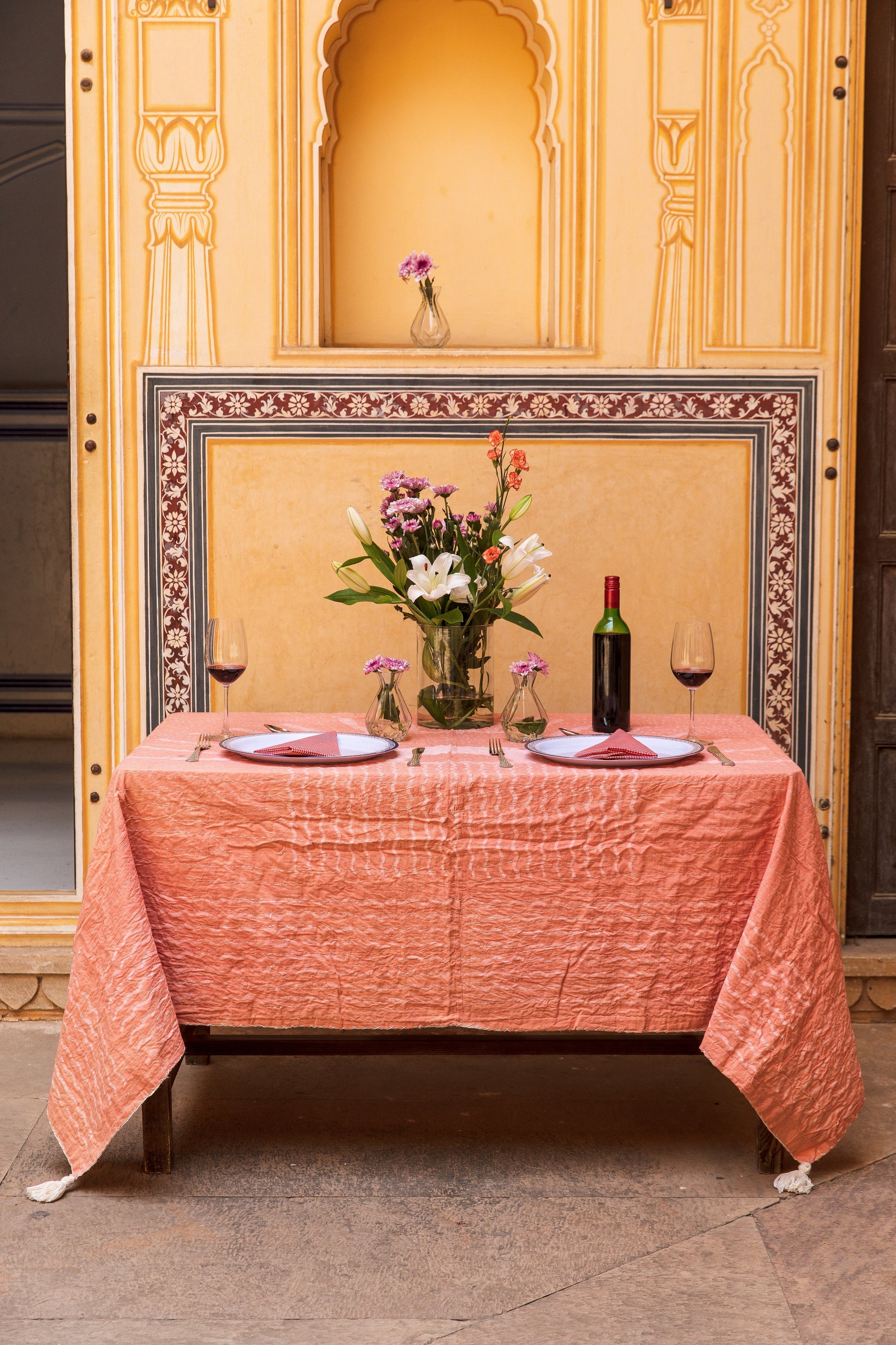 Infuse your dining space with a touch of serenity with this hand-block printed tablecloth, showcasing a soothing sunburst motif in soft, dusty pink. Each tablecloth is crafted by artisans who employ traditional techniques, from hand-carving wooden blocks to carefully applying natural dyes, creating a subtle yet striking design that brings warmth and calm to any table setting.
