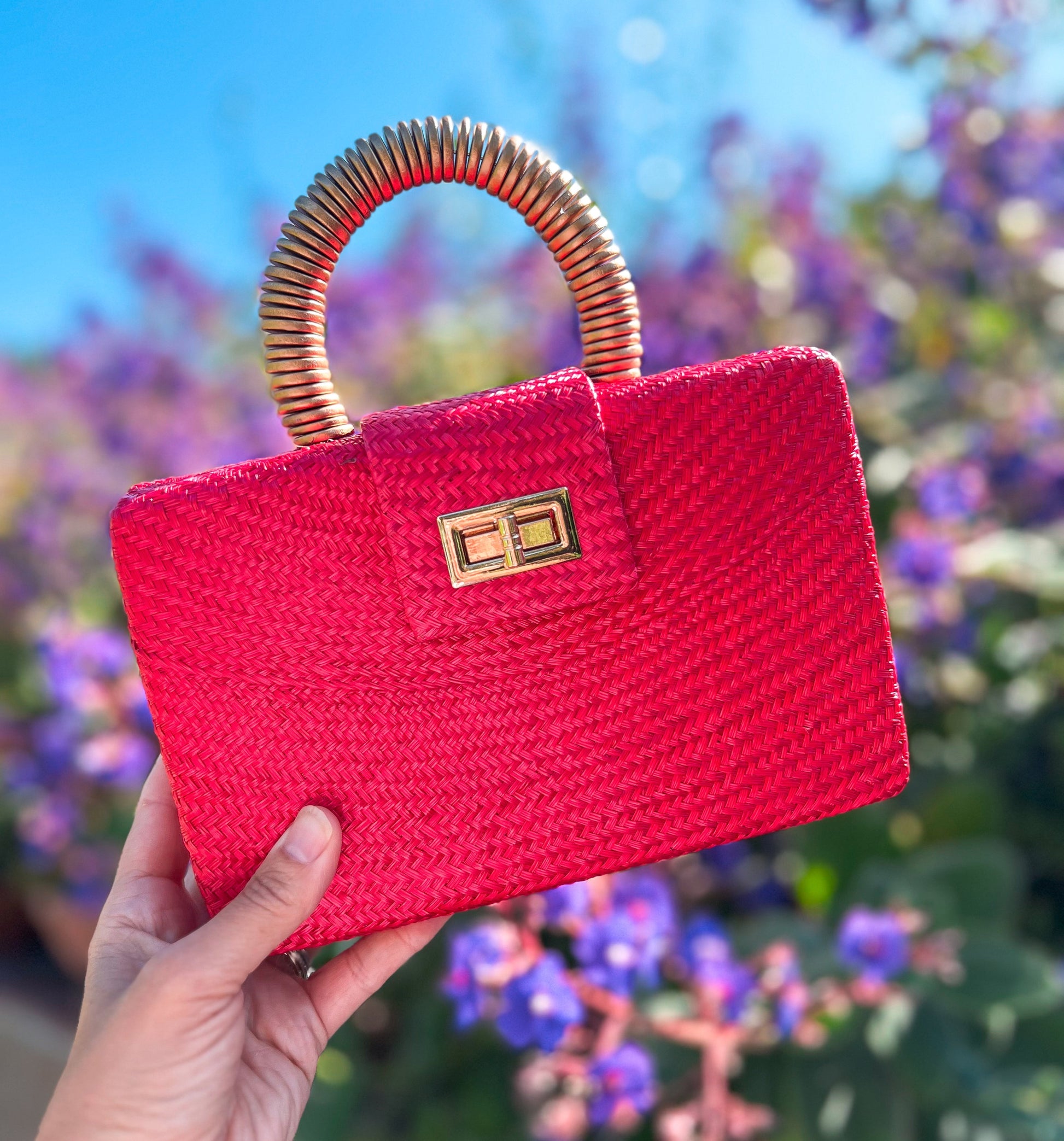 I Introducing THE GRACIE in elegant red and gold, the epitome of classic resort glamour. A stunning piece from the collection. This exquisite accessory marries natural textures with luxurious accents, capturing the essence of tropical paradise and carefree summer days. Key features: Handcrafted rectangular shape in red buntal straw Striking gold wooden rondelle bead top handle Spacious interior perfect for evening essentials Detachable crossbody strap included Versatile design suitable for both day and night occasions The Gracie Clutch showcases the intricate beauty of buntal straw weaving, a traditional Filipino craft. The red hue evokes images of sunset-painted skies, bringing an instant pop of joy to any ensemble. This clutch effortlessly transitions from poolside cocktails to glamorous evening soirées. Its generous size accommodates all necessary items without compromising on style, making it the perfect companion for any sun-drenched adventure. Size: 8.5" x 9" x 2.5" Dust bag included