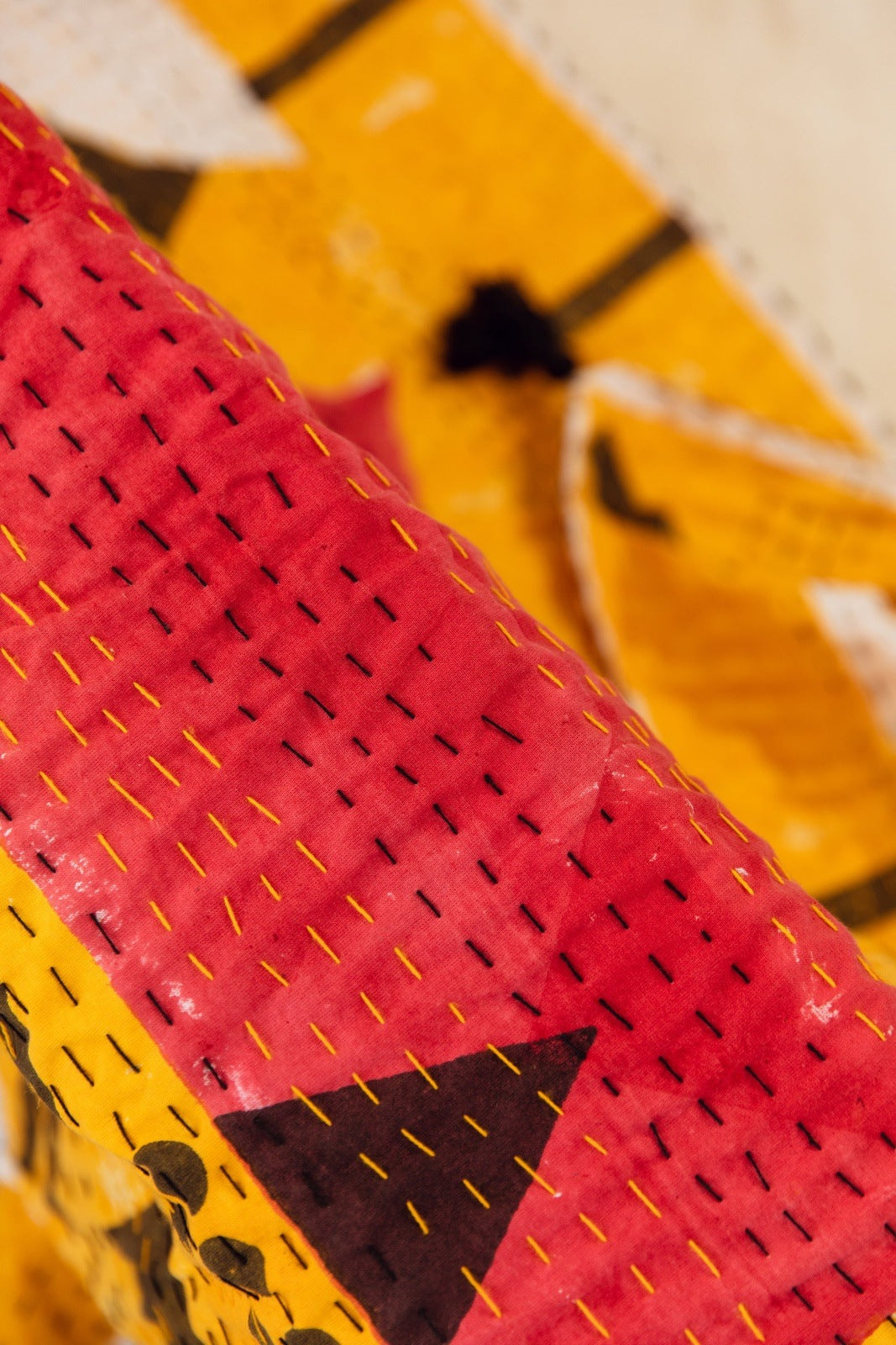 The design is hand-pressed onto pure cotton using hand-carved wooden blocks dipped in dyes. The printed cotton is brought to the homes of Kantha quiltmakers, who hand-stitch the cotton sheet onto a cotton base to create the final throw.